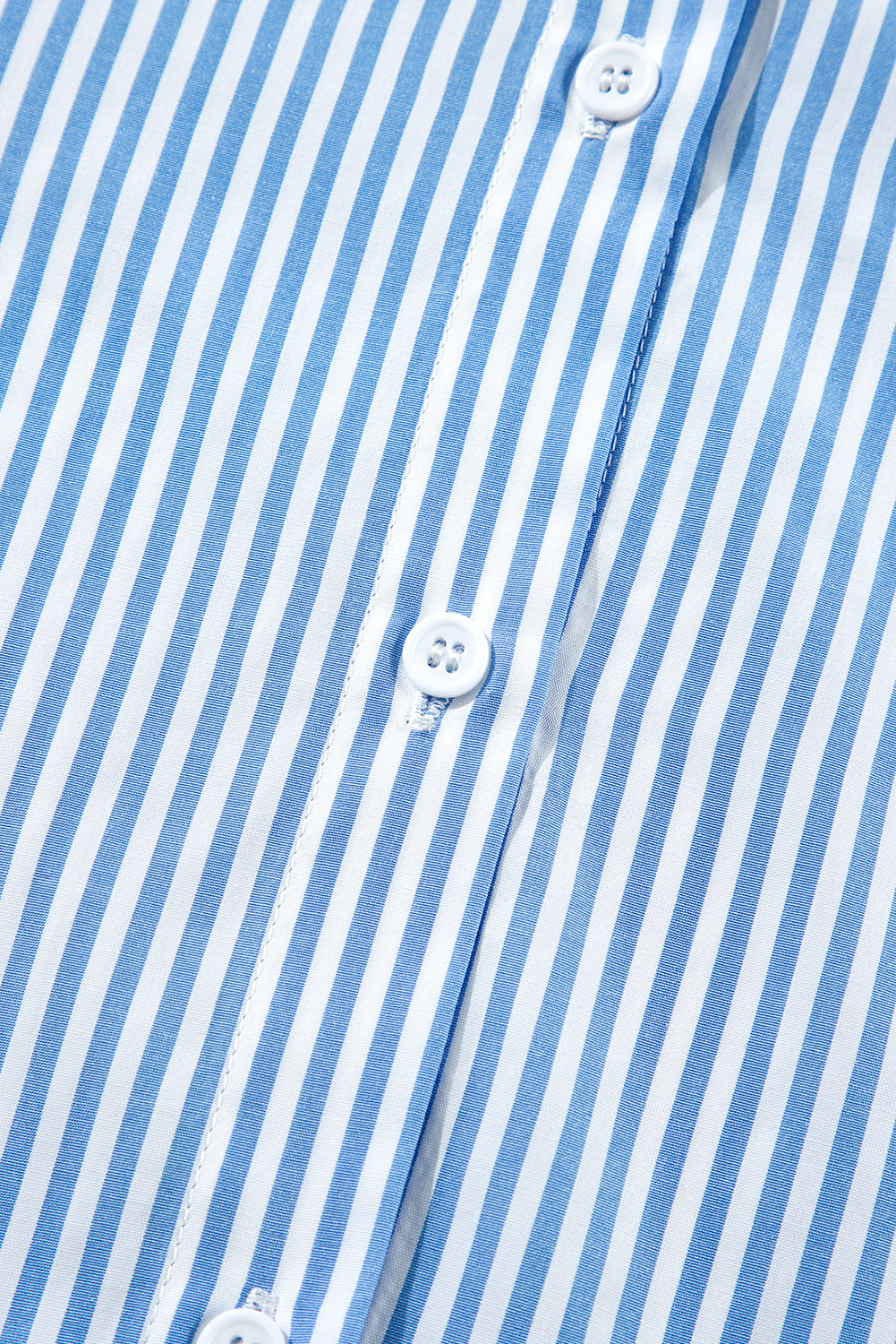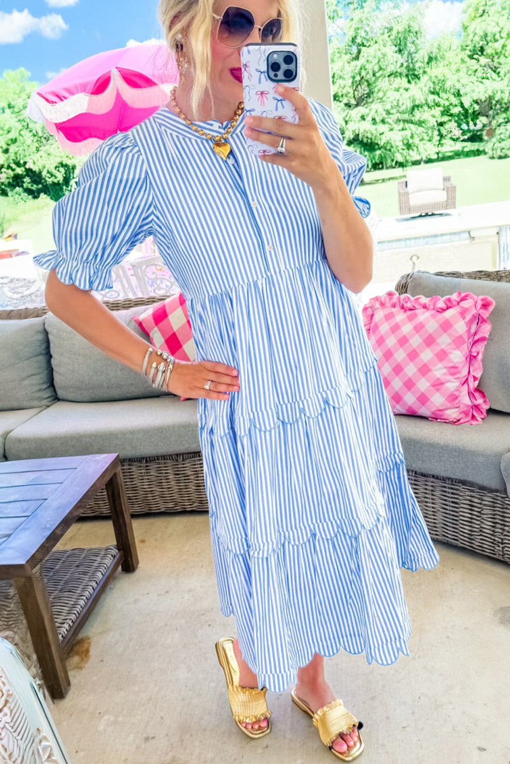 Sky Blue Stripe Bubble Sleeve Scallop Tiered Dress