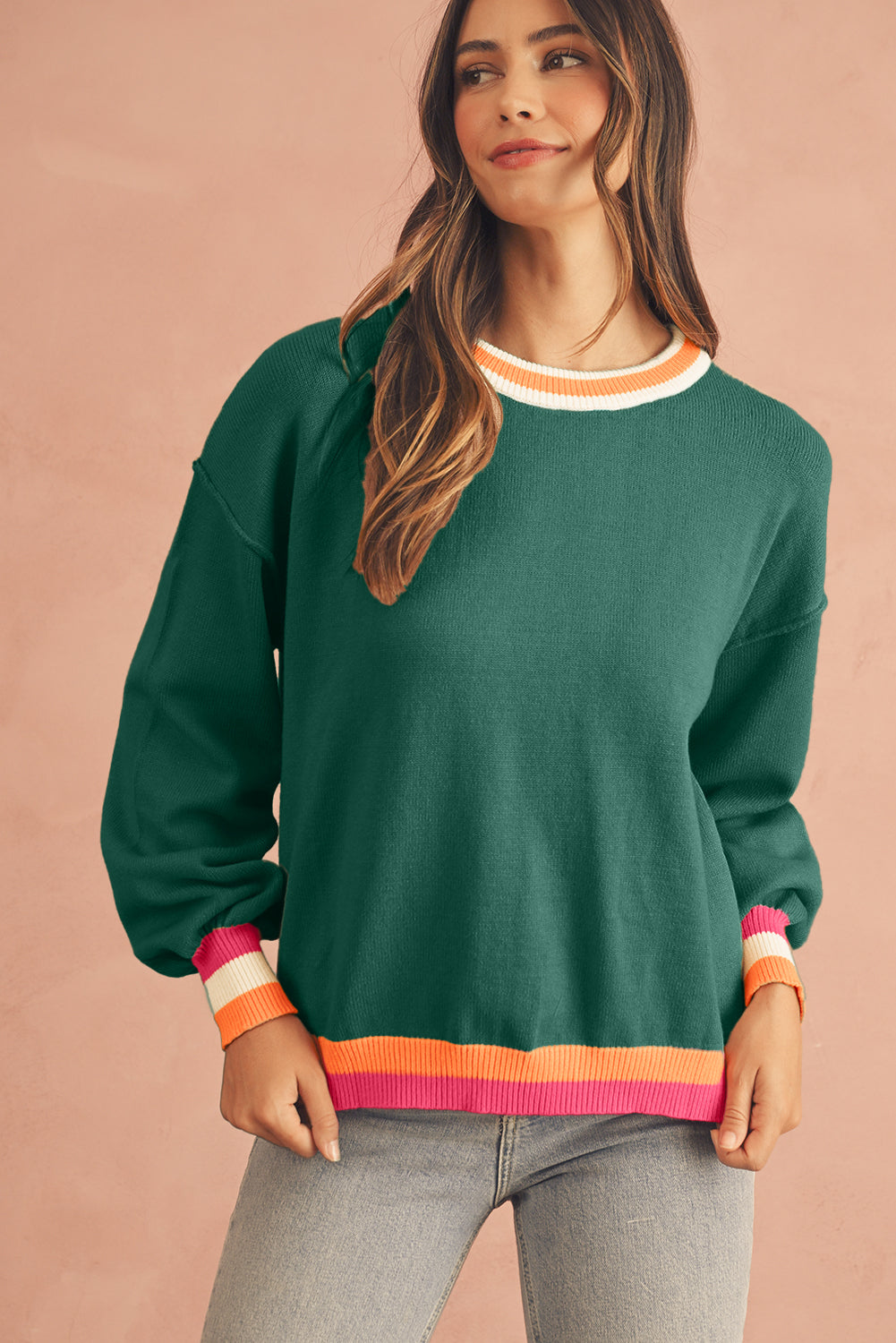 - Color-block striped trim enhances the sweater’s visual appeal.