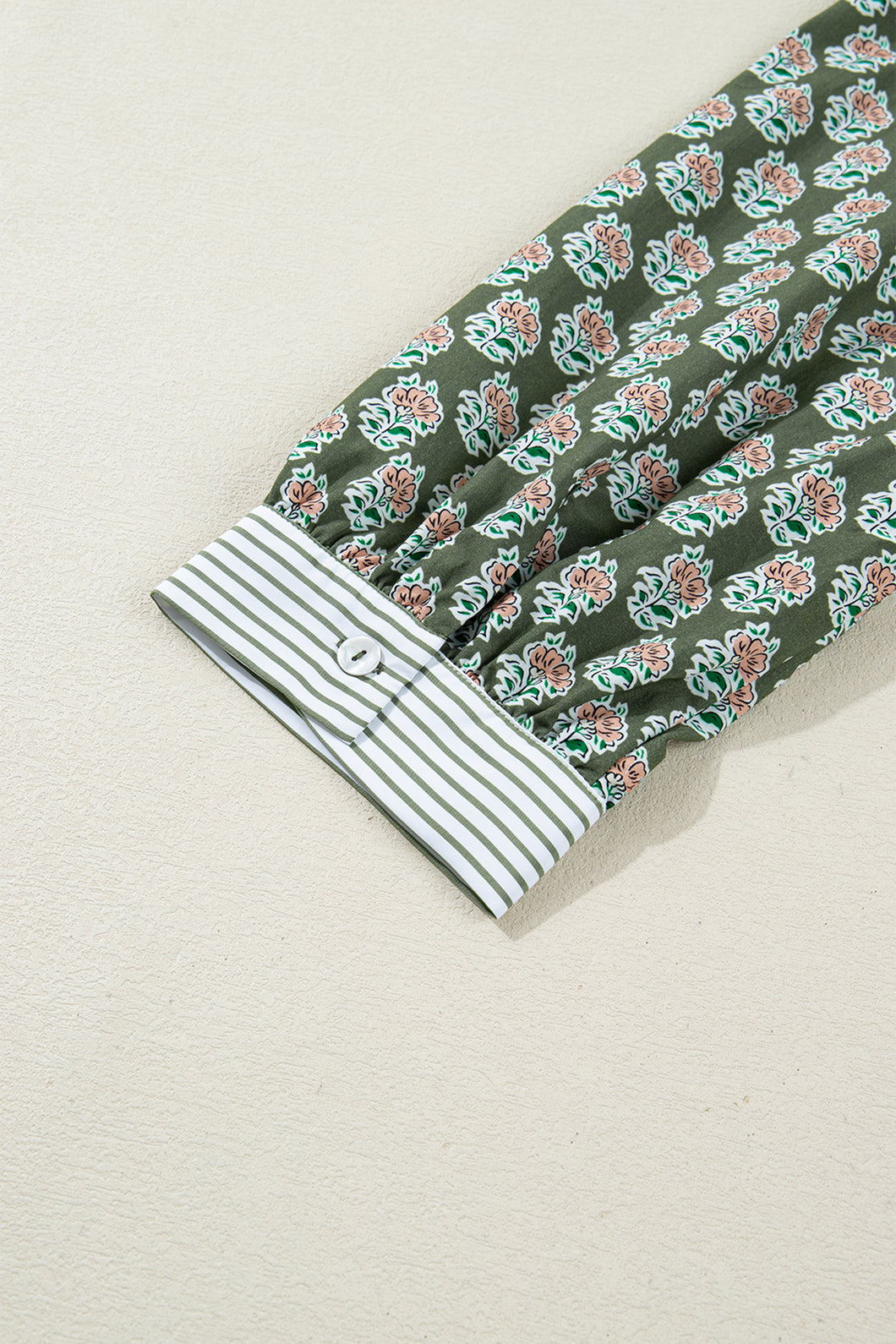 Green Contrast Striped Frilled Collar 3/4 Sleeve Plus Size Floral Dress