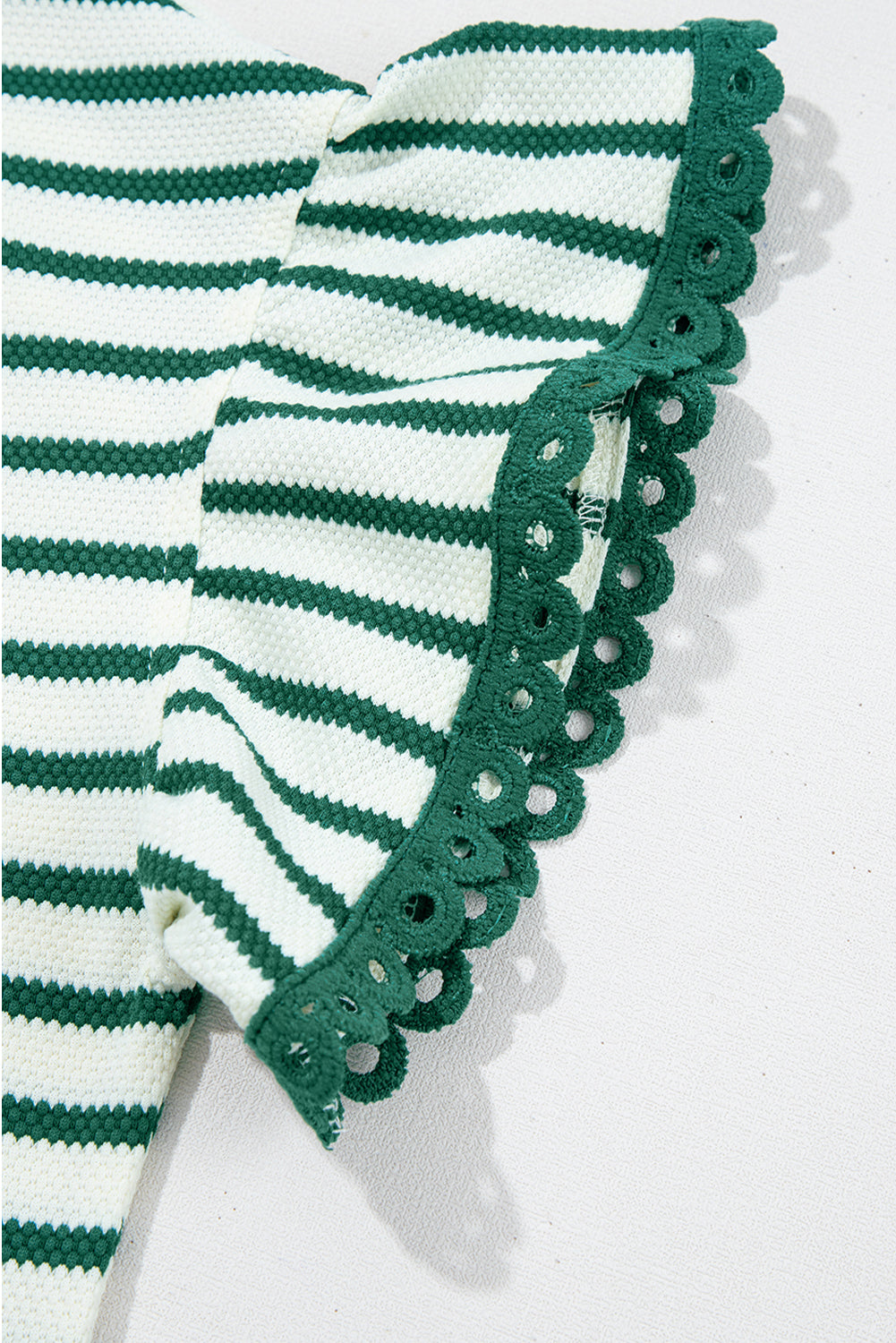 Black Stripe Scallop Lace Trim Ruffle Sleeves Crewneck Top