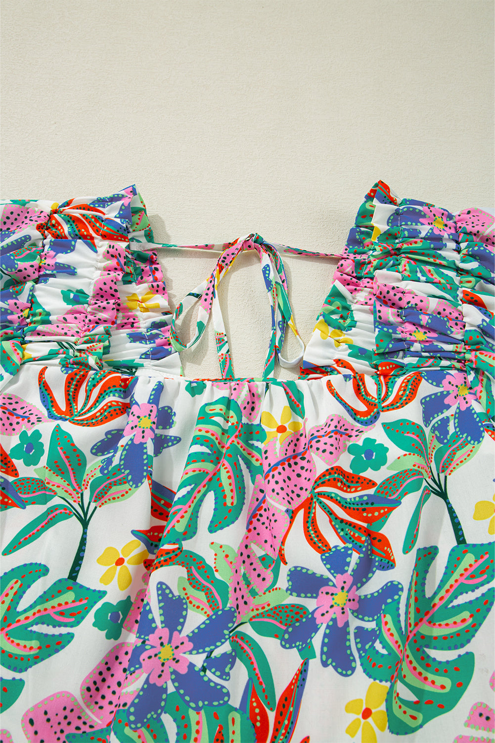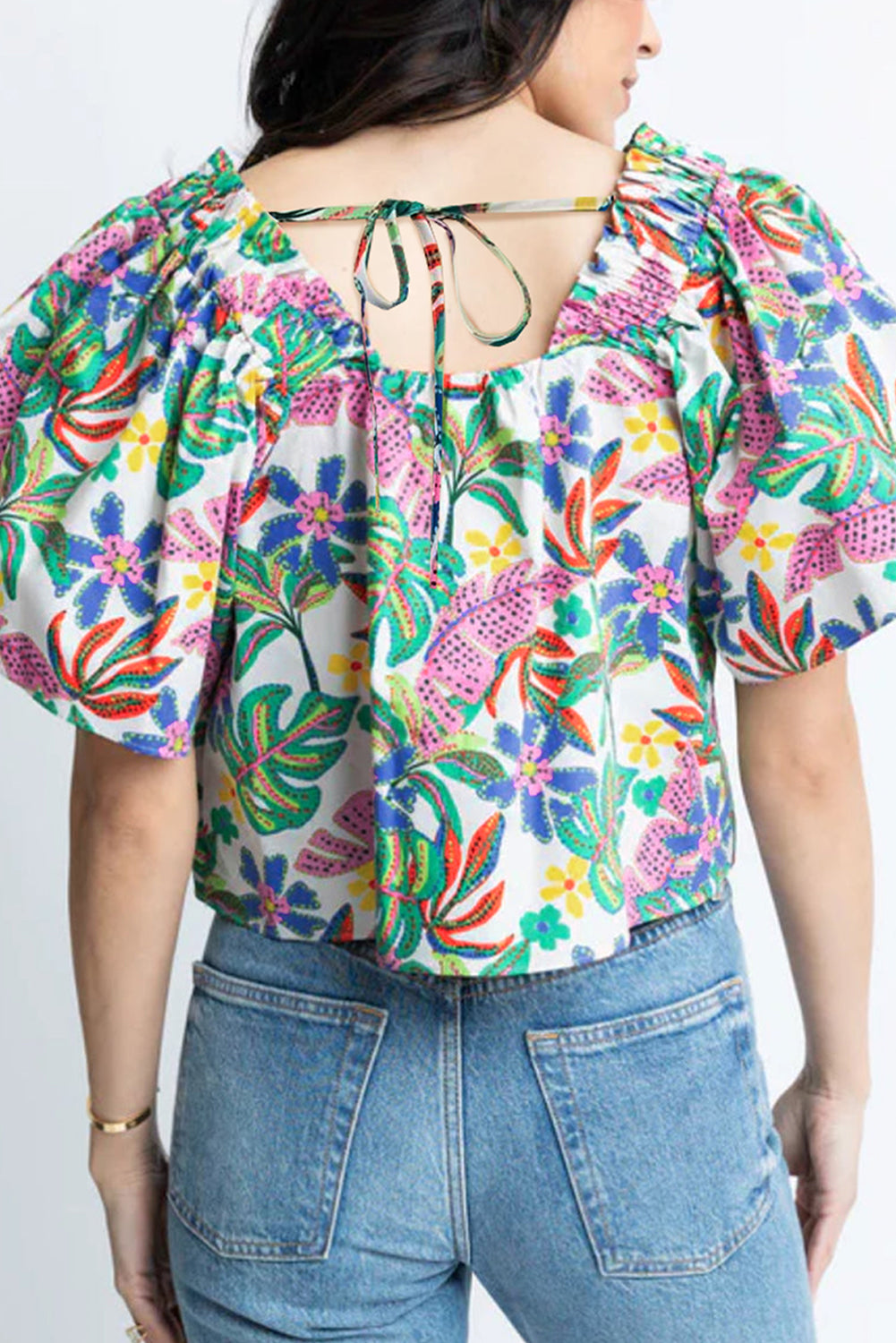 Green Floral Print Loose Fit Puff Sleeve Square Neck Blouse