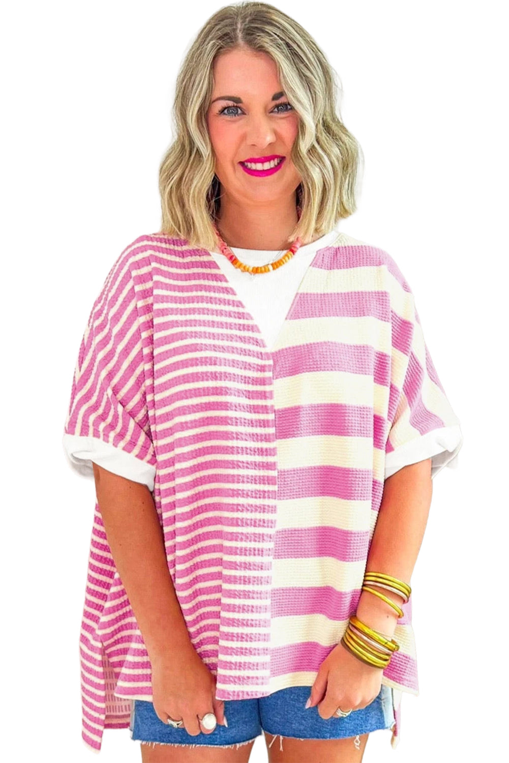 Pink Stripe Waffle Patchwork Short Sleeve High Low Loose T Shirt