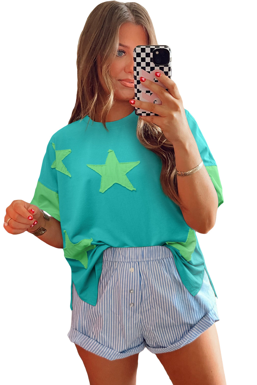 • Featuring star patches on the front, this tee exudes a playful and youthful vibe, making it a fun and versatile addition to your wardrobe.