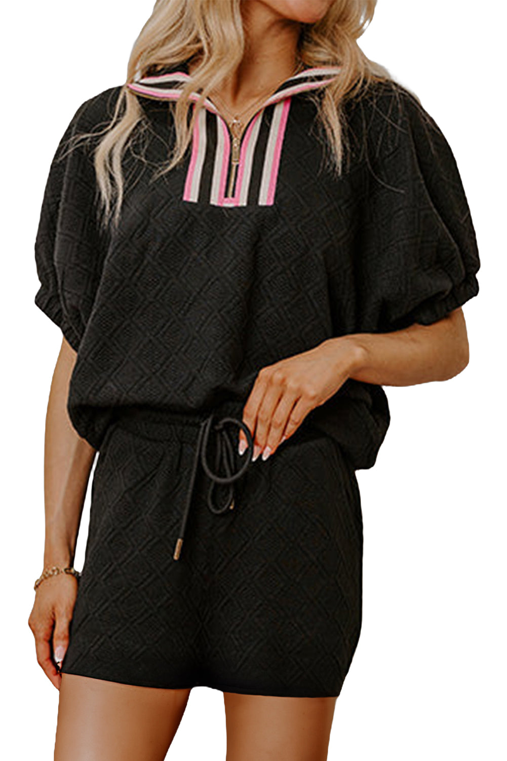 Black Striped Pop of Color Collared Checkered Textured Shorts Set